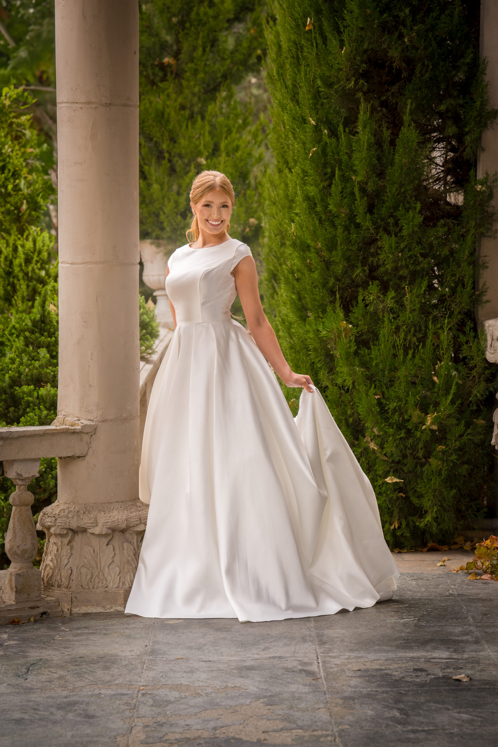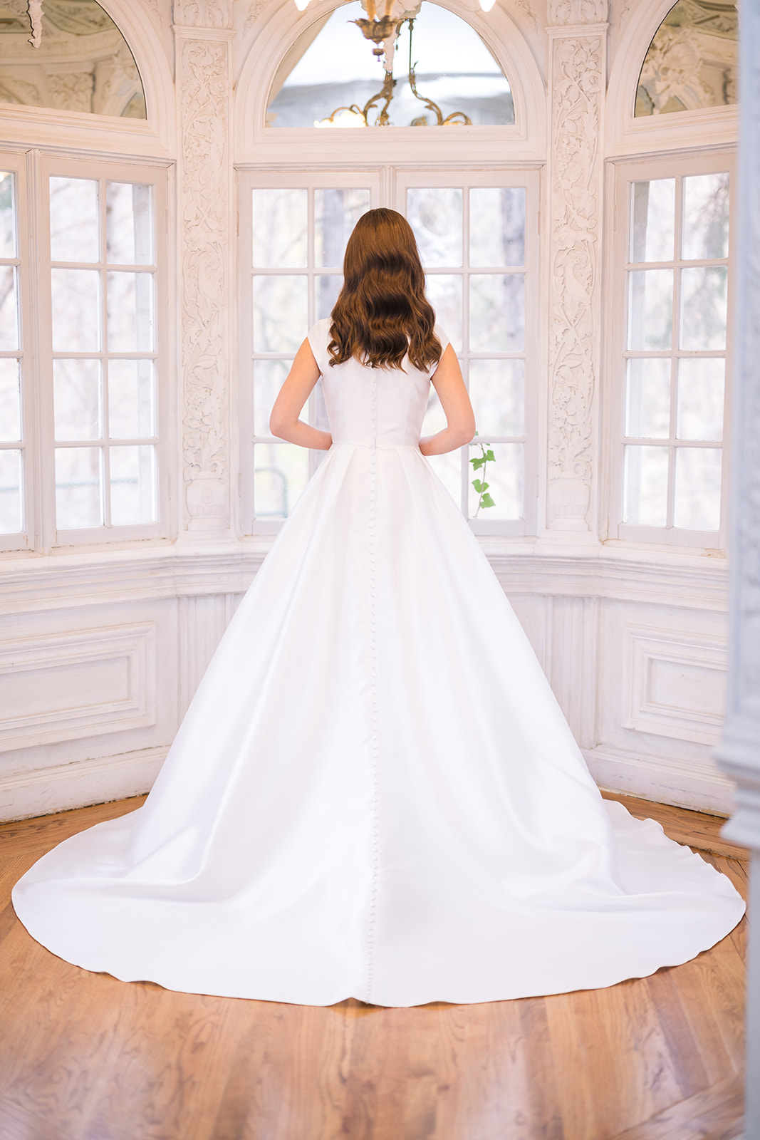 Dress Info: ballgown silhouette made of Mikado with pockets and buttons down the train. She features a scoop bateau neckline, cap sleeves and a basque waist. *gown can be ordered without basque waist- this is the Belinda gown and is shown in the last two photos.