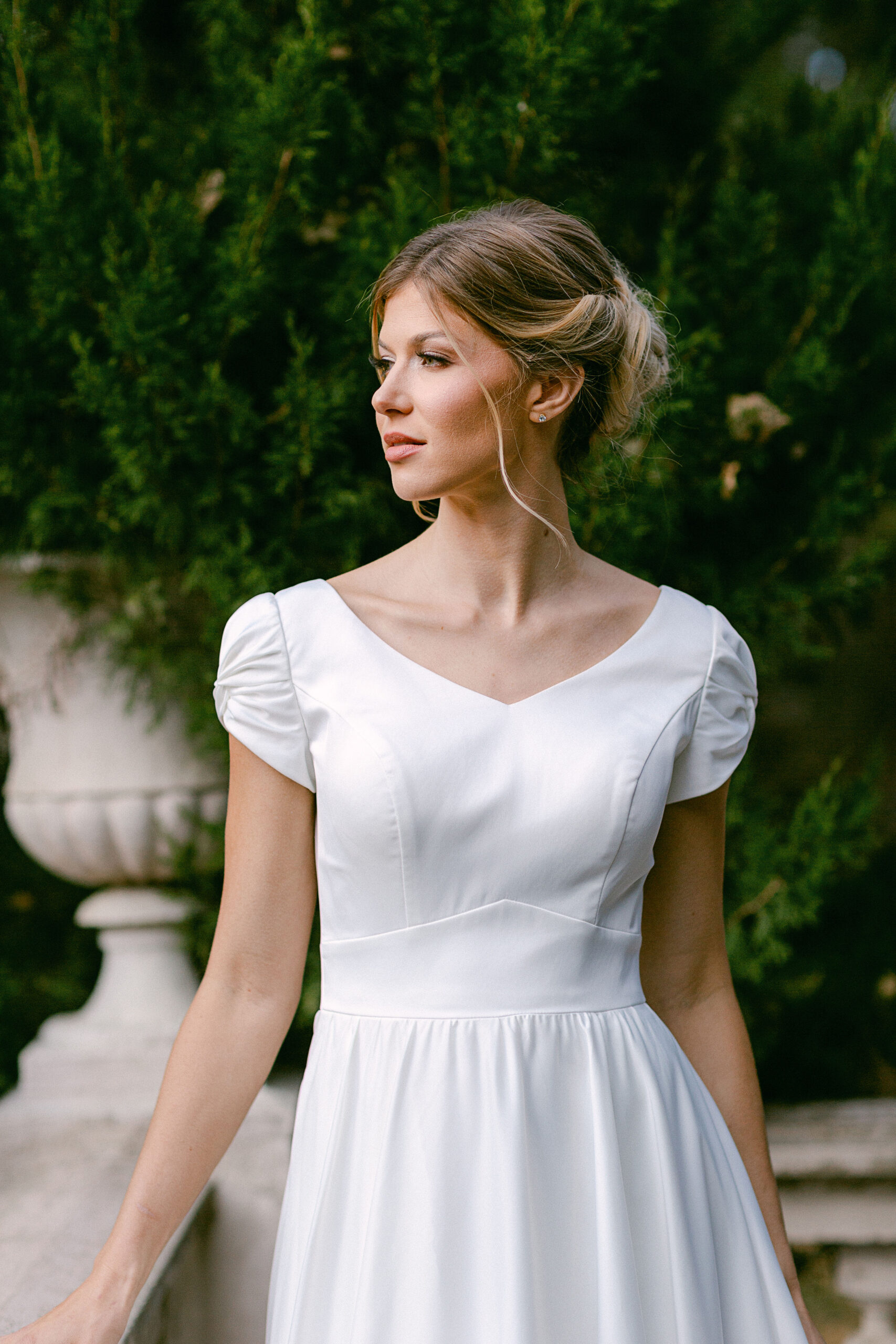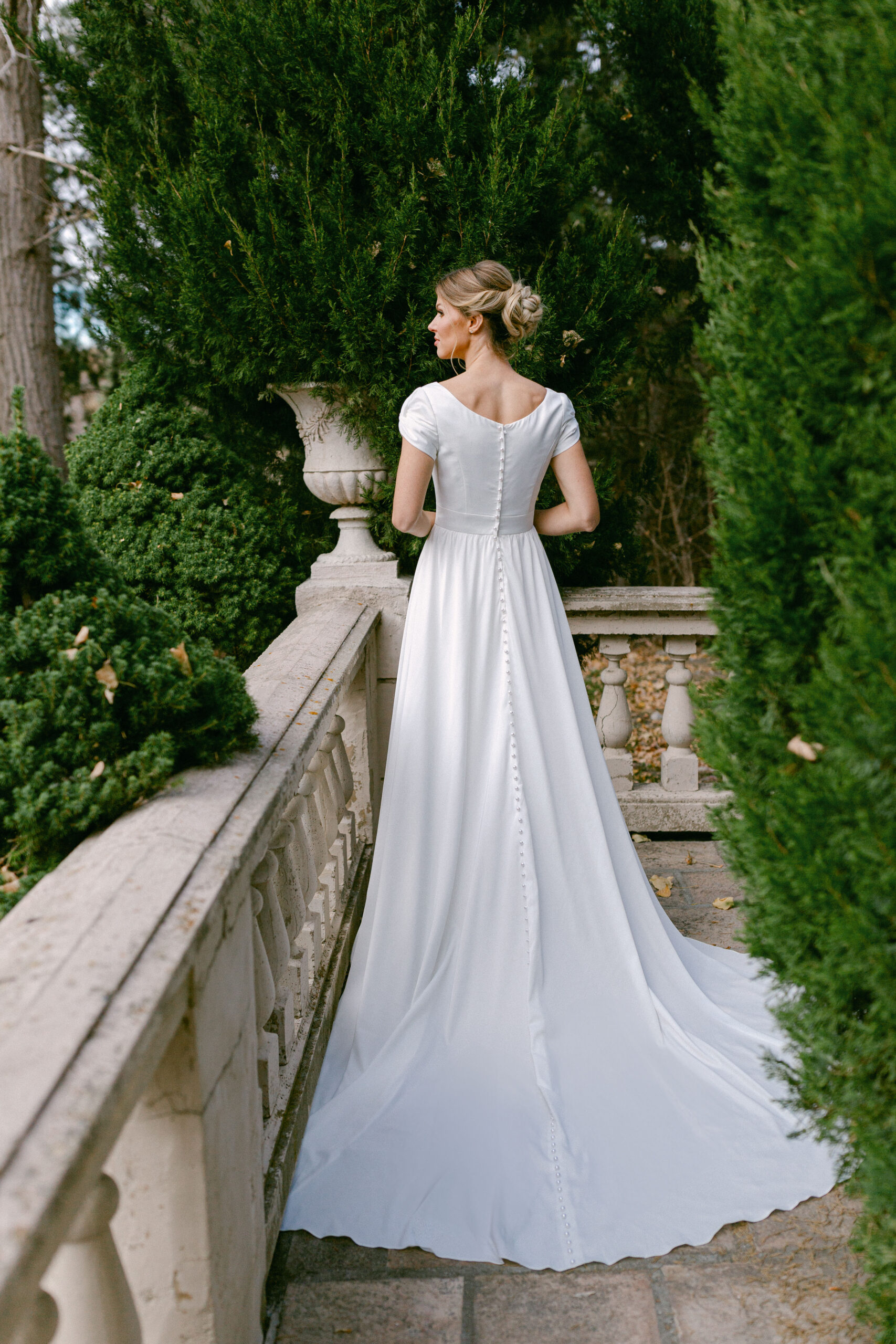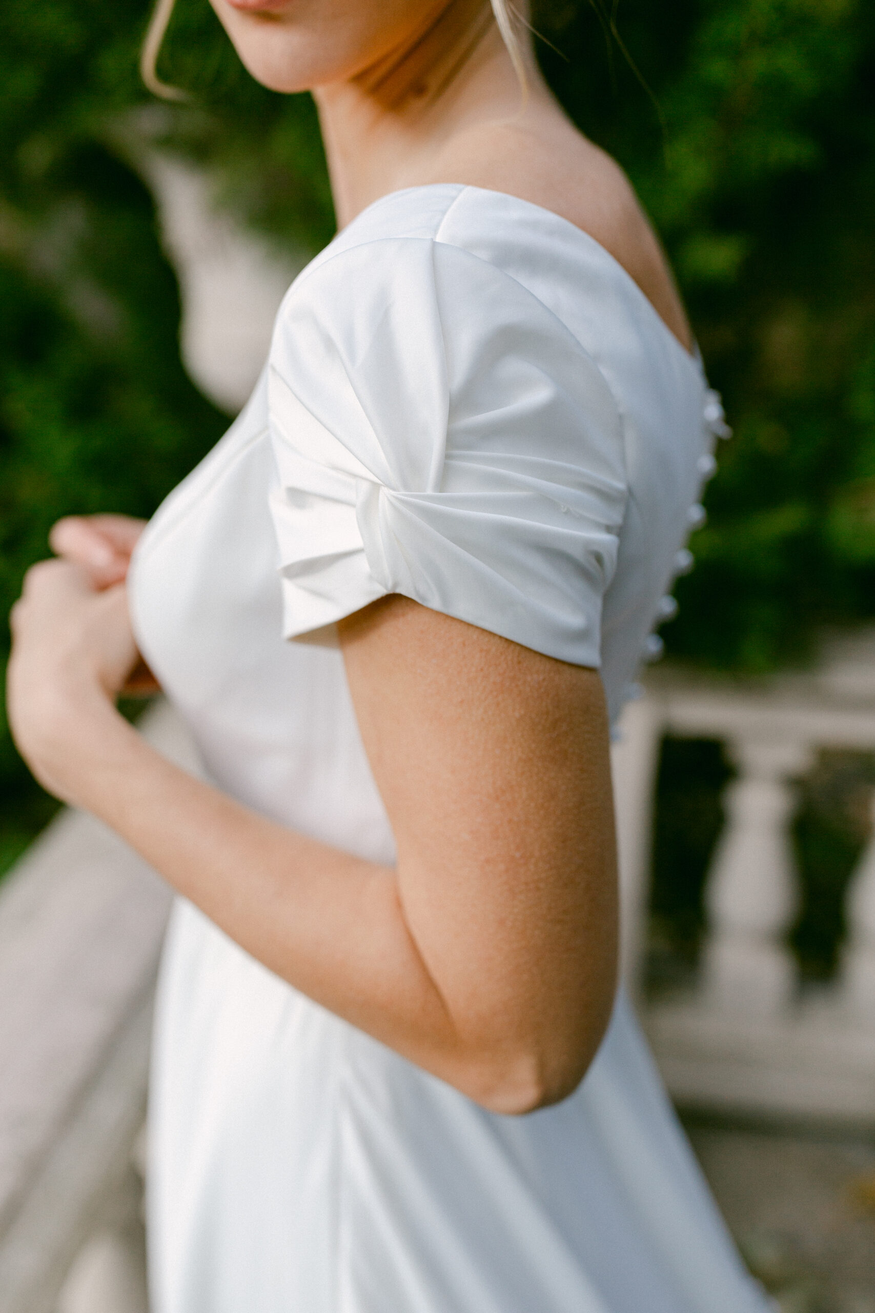Dress Info: silk charmeuse gown that showcases a clean, graceful silhouette with a soft, luminous drape. She features a modest wide V-neckline, delicate twisted short sleeves and a romantic A-line skirt with pearl buttons down the lenght of the court train. Understated and timeless, it’s a refined choice for the modern romantic.